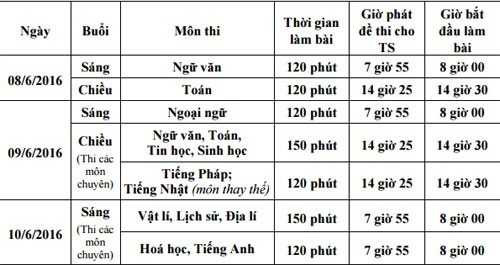 Ngày 8/6, thí sinh sẽ thi hai môn Toán và Tiếng Việt. Với những thí sinh thi chuyên sẽ thi các môn chuyên vào hai ngày (9 – 10/6). Năm học 2016-2017, Hà Nội tiếp tục thực hiện tuyển sinh vào lớp 10 THPT bằng phương thức xét tuyển kết hợp với thi tuyển.