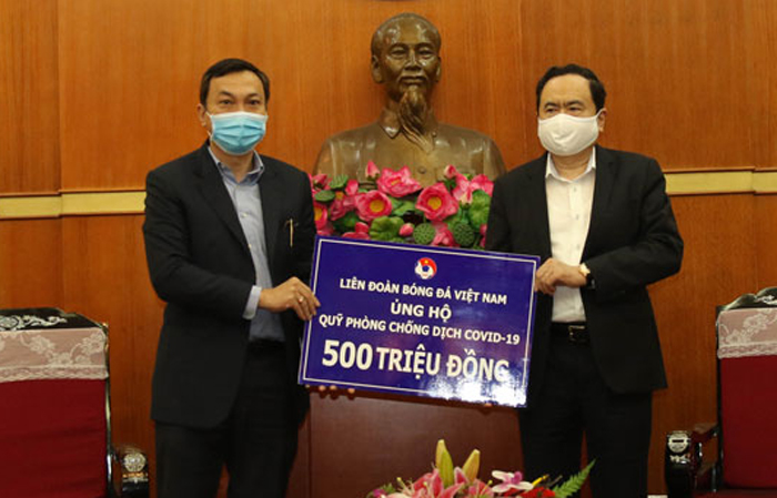 Tại cuộc gặp, Phó Chủ tịch thường trực LĐBĐVN Trần Quốc Tuấn cho biết: “Thông qua UBTW MTTQ Việt Nam, LĐBĐVN đóng góp số tiền 500 triệu đồng tới Quỹ phòng, chống dịch COVID-19. Đây là tấm lòng của những người làm bóng đá, với mong muốn góp thêm nguồn lực vào công cuộc phòng, chống dịch Covid-19”.