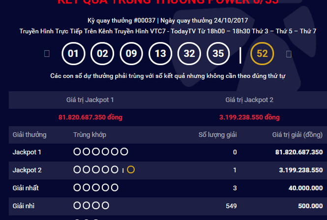 Sau hơn 2 tháng ra mắt sản phẩm xổ số tự chọn số điện toán Power 6/55, đây là lần thứ ba có khách hàng trúng giải Jackpot 2. Cả 2 khách hàng may mắn trúng Jackpot 2 trước đó đều quyết định công khai hình ảnh và thông tin cá nhân. Trong đó, Vietlott đã hoàn thành thủ tục trao thưởng cho khách hàng đầu tiên là ông Tùng (sống tại TP HCM), Vietlott sẽ trao thưởng công khai cho khách hàng còn lại trong thời gian tới.