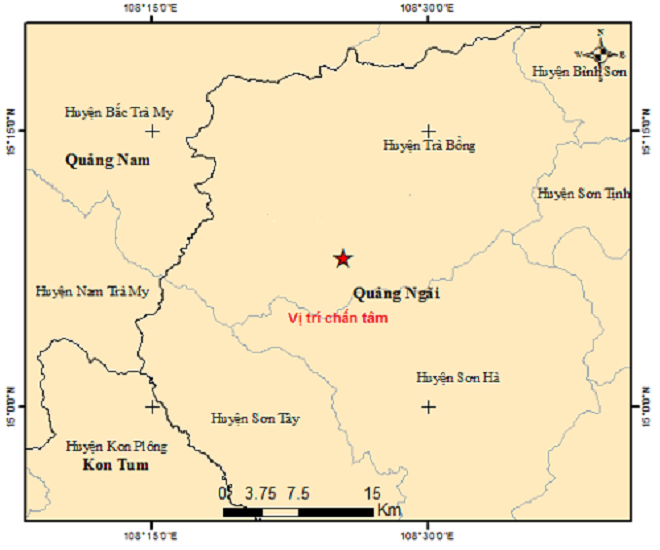 Theo đó, vào hồi 11h17 cùng ngày, trận động đất có độ lớn 3 độ Richter xảy ra tại vị trí có tọa độ 15.135 độ vĩ Bắc, 108.424 độ kinh Đông, độ sâu chấn tiêu khoảng 9.2km. Động đất xảy ra ở huyện Trà Bồng và cấp độ rủi ro thiên tai cấp 0.