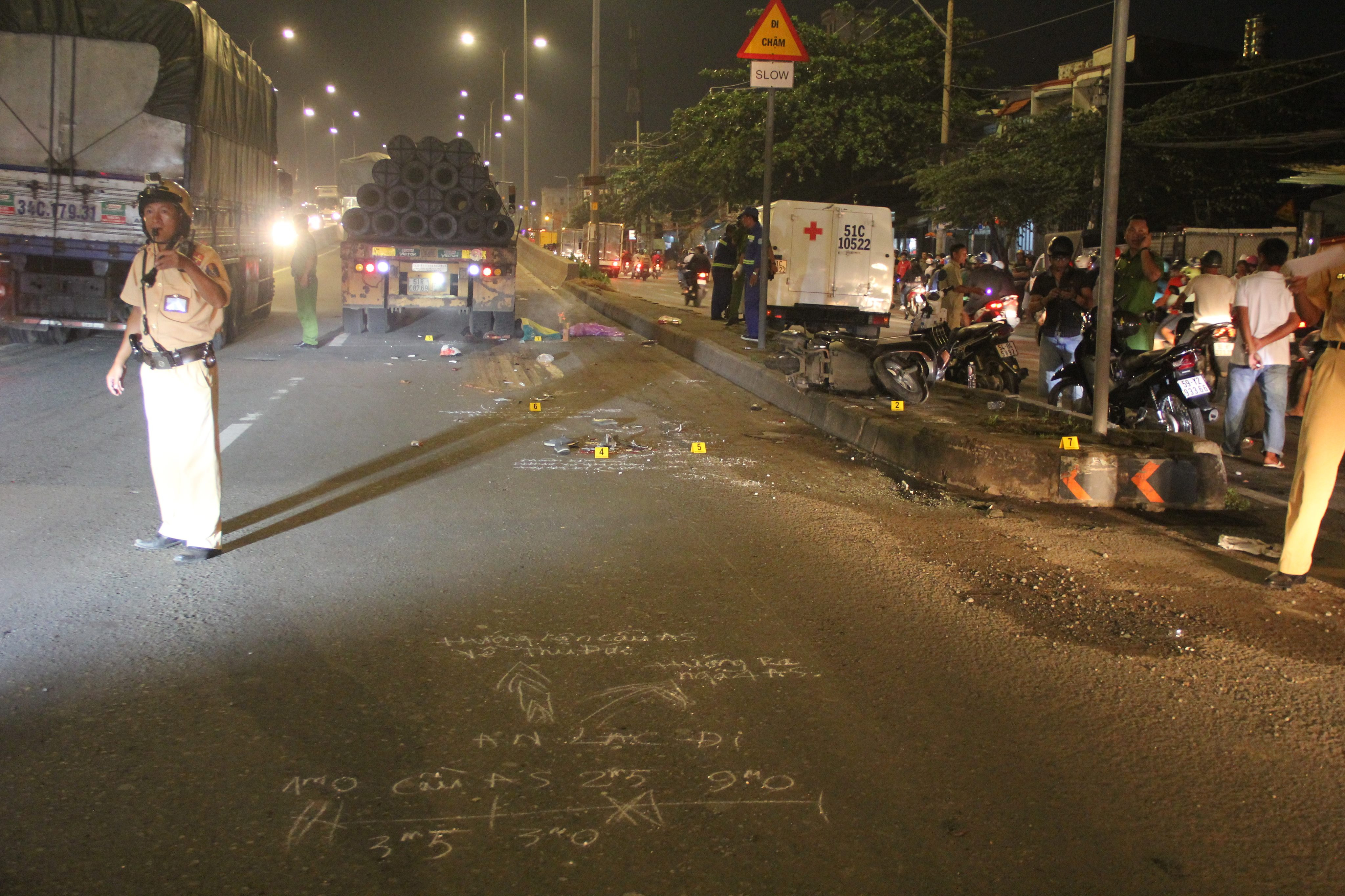 Công an đang khám nghiệm hiện trường vụ tai nạn ở quận Thủ Đức. (Ảnh: SONG NGƯ)