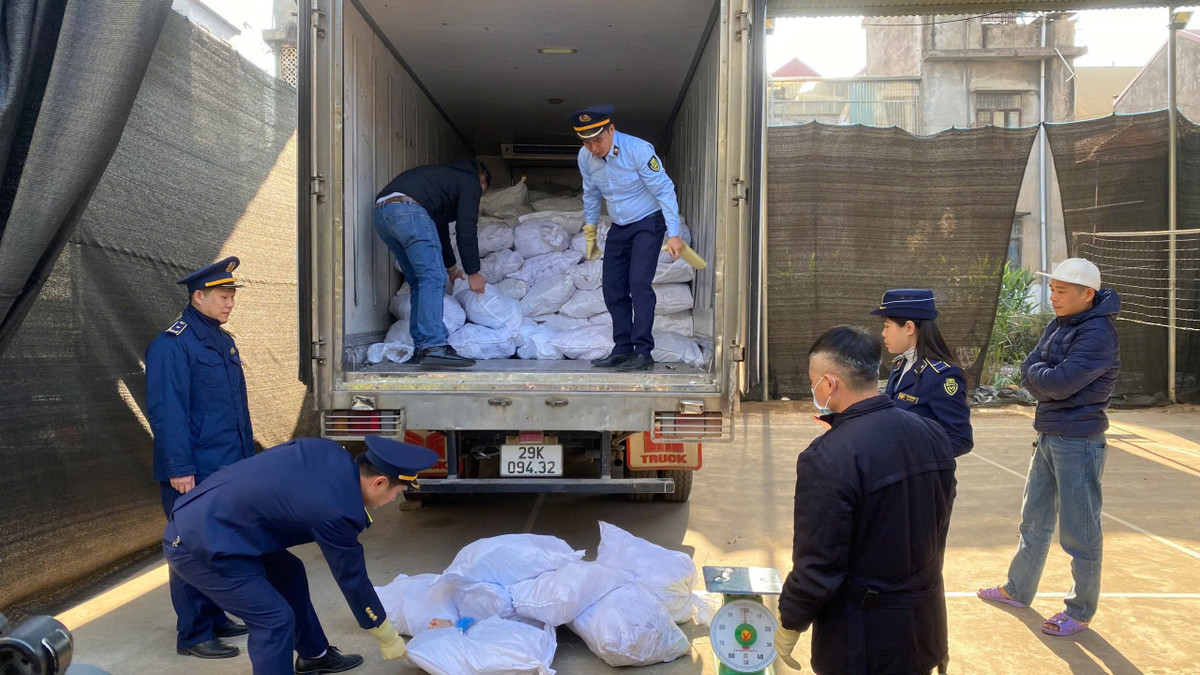 Qua quá trình khám phương tiện vận tải, đoàn kiểm tra phát hiện 3.000 kg móng giò lợn đông lạnh được đựng trong 150 bao tải dứa, trên bao bì hàng hoá không có nhãn mác, chữ viết hay thông tin thể hiện nguồn gốc, xuất xứ của hàng hoá, không có giấy chứng nhận kiểm dịch của cơ quan Thú y đối với hàng hóa, không có tài liệu kèm theo hoặc bất cứ thông tin nào khác.