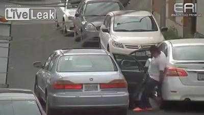 Một tên mở cửa sau và đứng canh, còn tên kia thì dùng dụng cụ tháo lốp xe của chiếc ô tô đang đỗ trên đường.