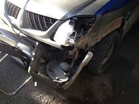 | Chiếc xe của lực lượng thanh tra giao thông bị xe tải vi phạm đâm hỏng. |