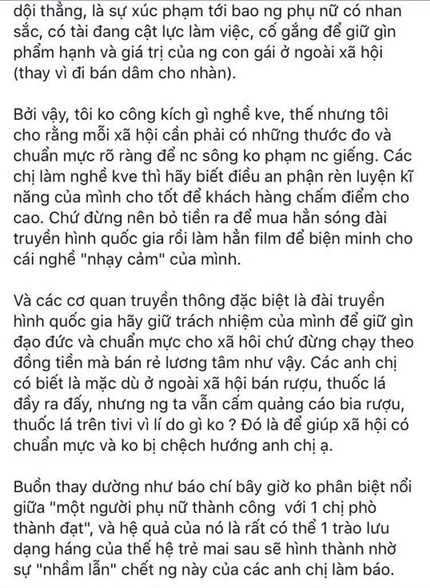 Anh trai: Dù sao anh cũng mang hình hài của 1 thằng đàn ông thì tốt nhất anh đừng nên mạt sát phụ nữ nhất là em không liên quan đến cuộc đời anh, làm nghệ thuật cũng nên nói chuyện cho có nghệ thuật 1 chút, nếu anh mặc váy như em thì em không quan tâm, em biết anh thích đàn ông nhưng không có nghĩa phụ nữ đối với anh phải đáng bị mạt sát như vậy.