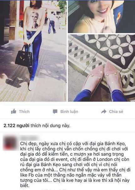 Nữ hoàng nội y viết: “Hãy làm tốt công việc của mình trước khi mạt sát và phán xét người khác. Mạt sát nếu làm bạn thấy vui hơn thì xin mờicứ việc. P/s: Chị yêu có gia đình rồi thì nên an phận và quy ẩn giang hồ, chuyện quá khứ lẫy lừng của chị cũng không đẹp hơn ai đâu mà đi phán xét người khác, không khéo đến tai anh chồng trẻ của chị thì uổng công chị che giấu bấy lâu nay.