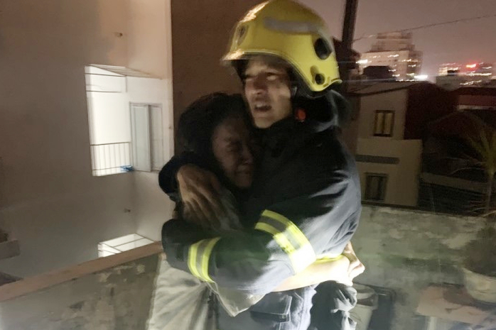 Cô gái trẻ khóc nức nở, ôm chầm lấy người lính cứu hoả sau khi được cứu ra khỏi đám cháy.