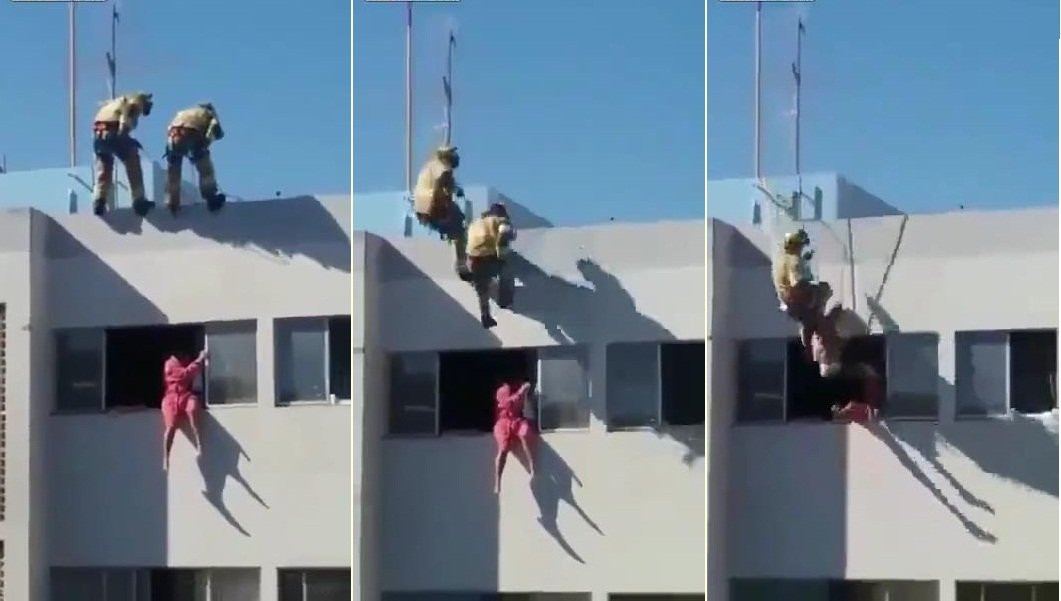 Khoảnh khắc 2 chàng lính cứu hỏa Brazil đu dây từ trên cao xuống, đạp người phụ nữ định nhảy lầu tự tử văng ngược vào trong phòng khiến người xem thót tim.
