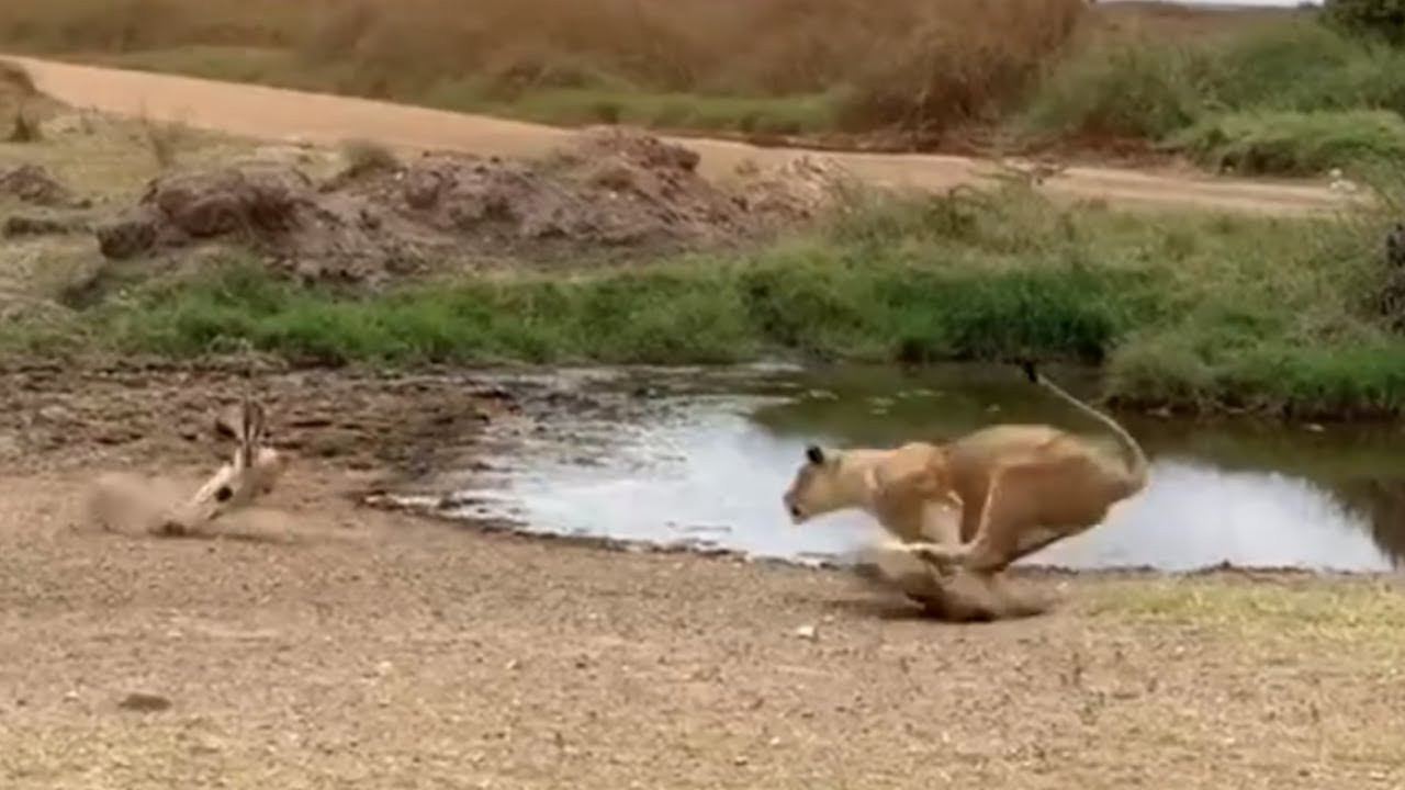 Con sư tử nghĩ rằng linh dương sẽ chạy cùng hướng với mình, nhưng may mắn cho linh dương, động tác giả chớp nhoáng giúp nó thoát chết ngoạn mục.