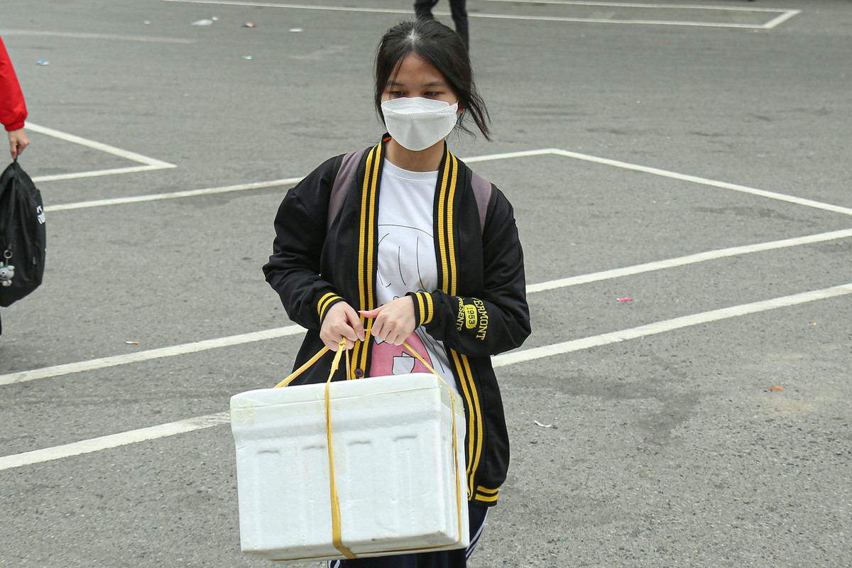 Sau hành trình gần 3 tiếng bằng ô tô khách, bạn Lam Thanh (ở Nam Định) trở lại Hà Nội cùng thùng thức ăn lớn gia đình chuẩn bị từ ở nhà. "Mỗi lần về nhà bố mẹ đều chuẩn bị rất nhiều đồ ăn cho em mang lên Hà Nội. Mặc dù di chuyển với nhiều đồ đạc, thức ăn sẽ mệt hơn nhưng đồ ở quê luôn sạch sẽ, đảm bảo vệ sinh", Lam Thanh nói.