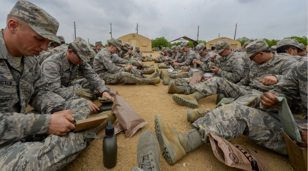 Tân binh thuộc Không quân Mỹ đang được hướng dẫn sử dụng các suất ăn MRE