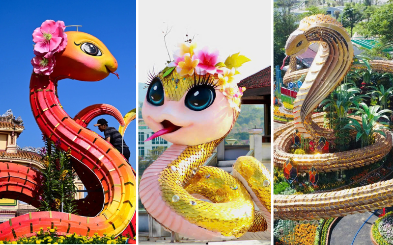 Cặp linh vật rắn tại chợ hoa xuân tỉnh Phú Thọ có biểu cảm sinh động, đôi mắt long lanh, đường nét mềm mại và màu sắc tươi sáng, tạo nên một không gian vui tươi và thân thiện. Nhiều người nói đây là "hoa hậu rắn" của năm nay. (Ảnh: PLO)