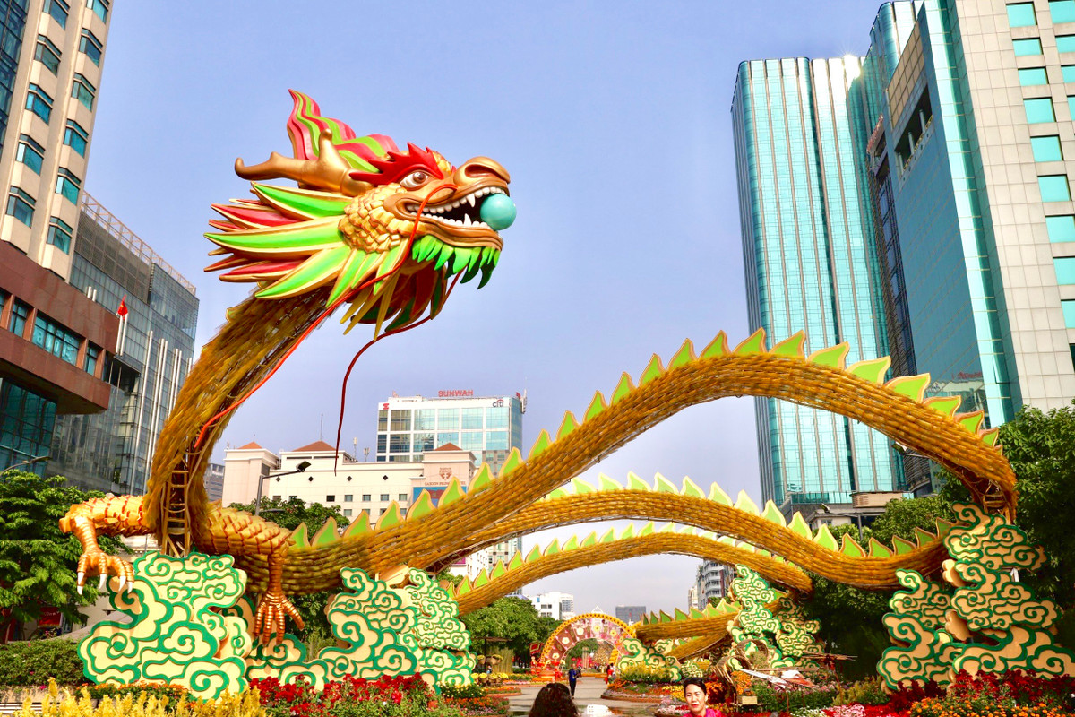 Với tổng chiều dài hơn 700m, đường hoa có điểm nhấn là cặp linh vật rồng ở đầu đường Nguyễn Huệ (đoạn gần UBND TP.HCM). Đôi rồng mang tên gọi "Lưỡng Long triều liên" uốn lượn đan xen nhau, đối xứng trên đường hoa.