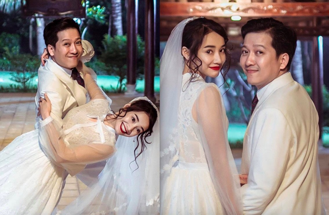 Trong ảnh, Trường Giang và Nhã Phương diện đồ cưới ton-sur-ton màu trắng.