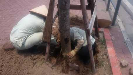 Sau khi dư luận phản ánh, báo chí đăng tải các thông tin liên quan đến cách trồng cây "đặc biệt" của Hà Nôi, hôm nay báo chí tiếp tục đưa tin về việc một nhóm công nhân đào đất xung quanh gốc cây, gỡ bỏ lớp lưới, dây được buộc vào bầu trên đường Lê Duẩn.