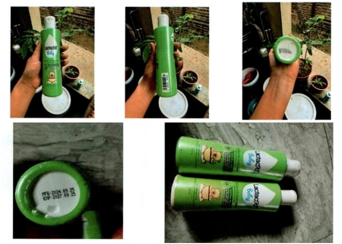 Mẫu giả thứ hai không có số lô, hạn sử dụng ghi 25/09/2027. Thiết kế bao bì tiếp tục sai lệch về phông chữ, nắp chai. Đặc biệt, công ty xác nhận không có sản phẩm nào thuộc dòng Lactacyd Baby Extra Milky được sản xuất vào ngày 25/09/2024 như in trên hộp. Chất và mùi sản phẩm khác rõ rệt so với hàng thật.
