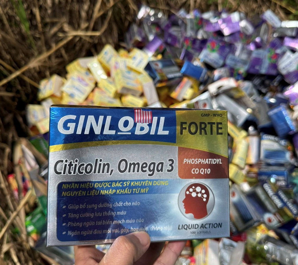 Bước đầu, lực lượng chức năng ghi nhận có 5 bãi đổ thuốc, thực phẩm chức năng dành cho người lớn và trẻ em. Trên bao bì có các loại thuốc, thực phẩm chức năng như Ginlobil, Vitamin A-D, Nattobet, Homramin Ginseng…Ngoài 5 bãi này còn có 1 bãi đã được đốt cháy hoàn toàn với diện tích khoảng 20m2.