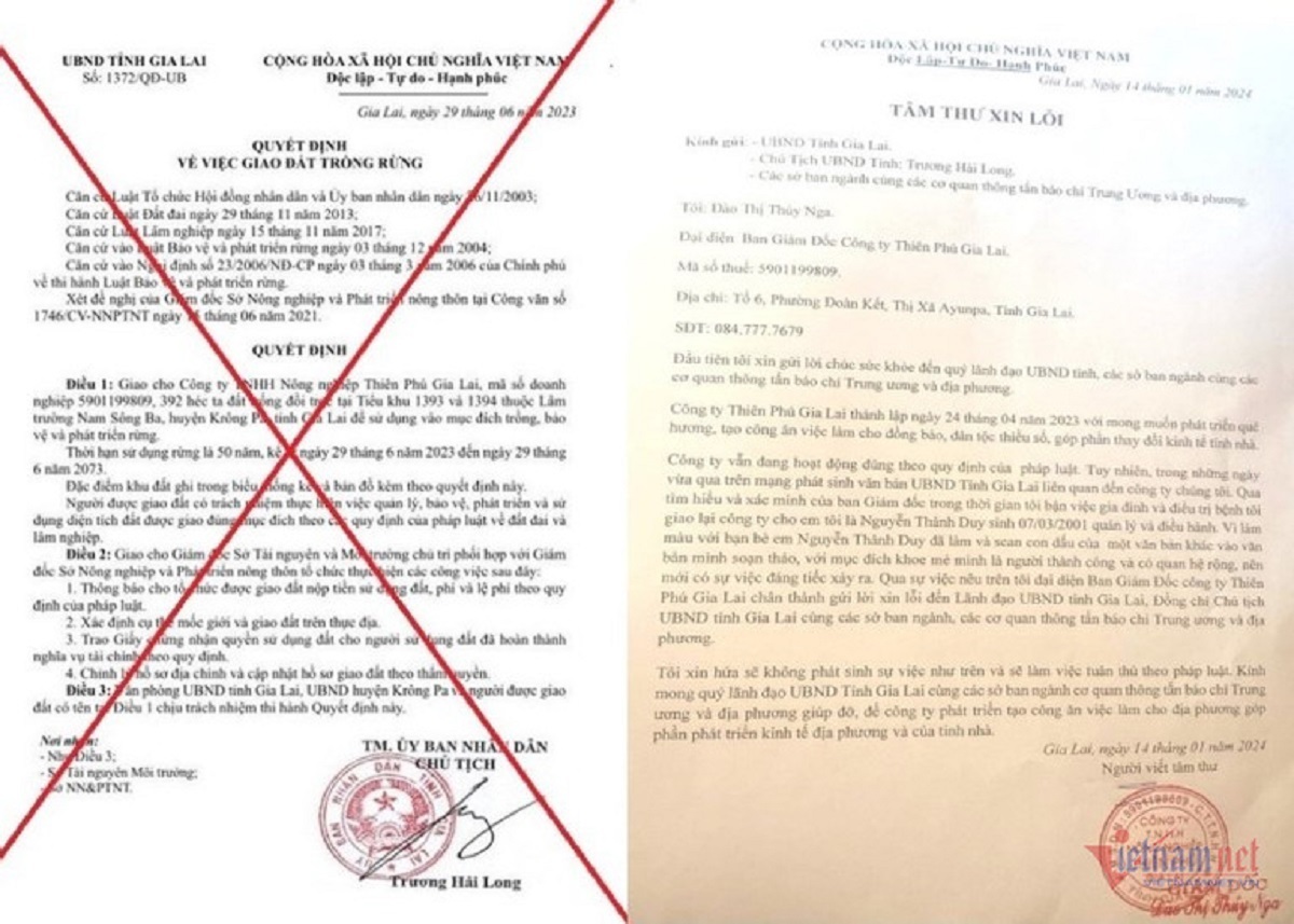 Chiều 16/1, thông tin từ Văn phòng UBND tỉnh Gia Lai cho biết đã nhận được "Tâm thư xin lỗi" của bà Đào Thị Thúy Nga, đại diện Công ty TNHH Nông nghiệp Thiên phú Gia Lai về việc mạo danh Chủ tịch UBND tỉnh Gia Lai Trương Hải Long để giao 392ha đất rừng cho doanh nghiệp