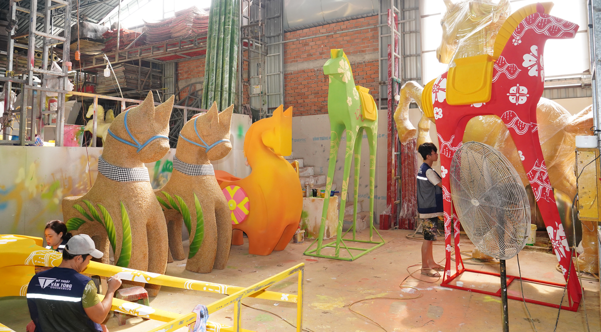 Tại cơ sở Tân Việt, nơi chịu trách nhiệm thi công đại cảnh Lý ngựa ô, Ngựa chín hồng mao và cùng nhóm linh vật ngựa ở đại cảnh cuối, các khâu thi công đang khẩn trương.