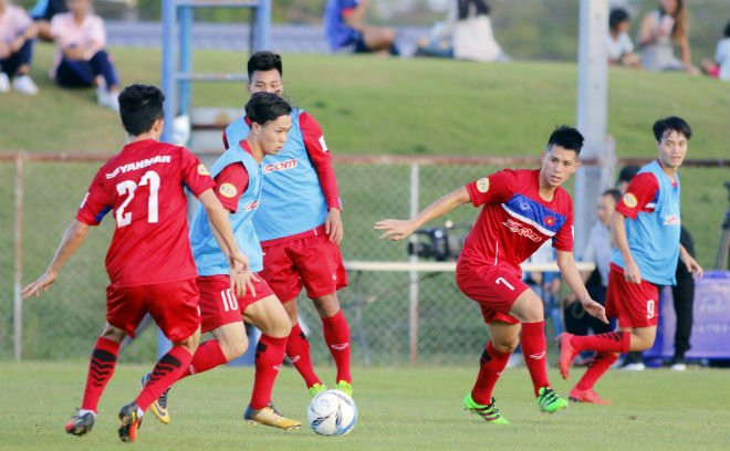 Ở buổi tập trước trận đấu ra quân gặp U23 Myanmar tại giải M-150 của U23 Việt Nam, HLV Park Hang Seo đã chia đội hình thành làm 2 để thi đấu đối kháng. Từ cách sắp xếp đội hình này, không khó để nhận ra đội hình chính sẽ đấu U23 Myanmar chiều nay.