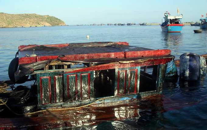 | Chiếc tàu chở dầu bị chìm nghi là thủ phạm gây ra vụ tràn dầu được ngư dân kéo vào bở biển xã Nhơn Hải vào chiều 11/7 - Ảnh: Ngọc Nhuận |