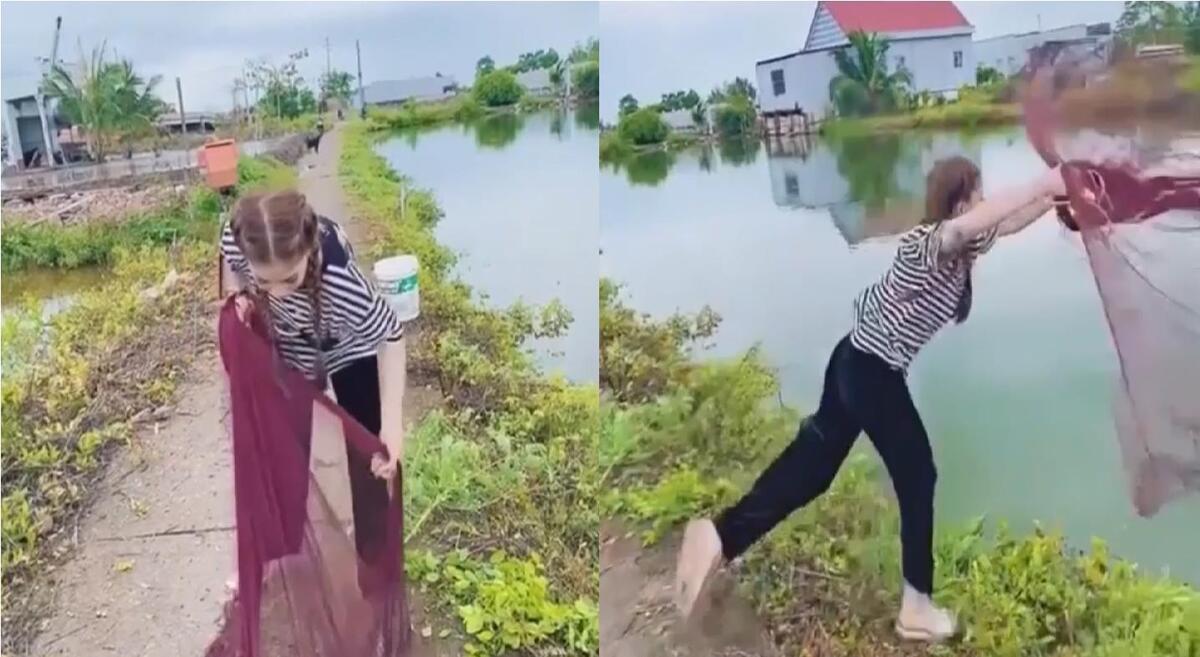 Cô gái xinh đẹp rất tự tin nhưng không ngờ lại lao tòm xuống nước trong lần đầu tiên quăng chài bắt cá.
