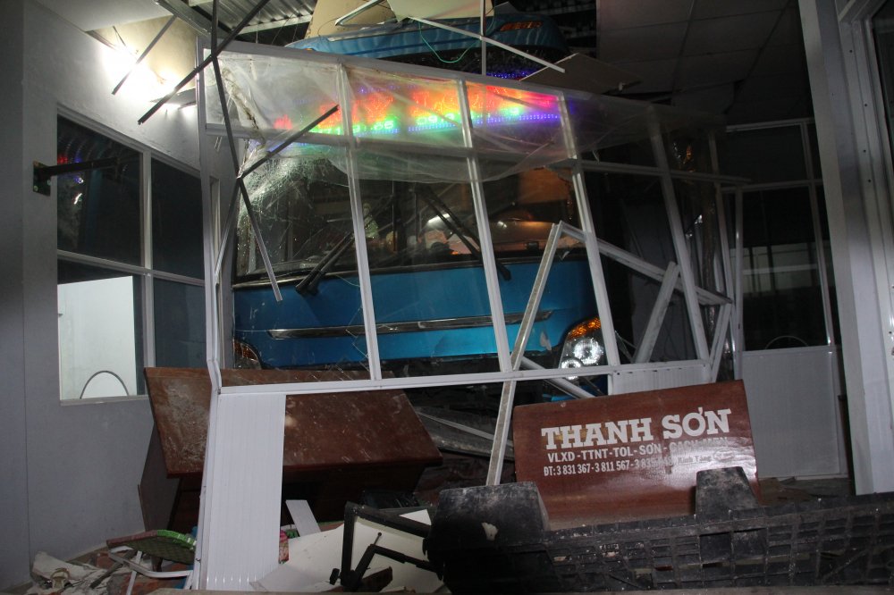 Tại hiện trường, chiếc xe khách bị hư hỏng nặng. Một bức tường của nhà chờ trong bến bị tông sập.