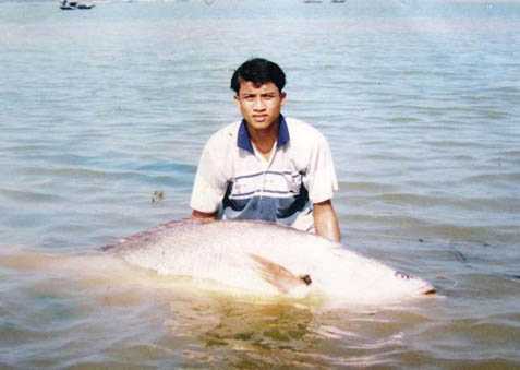 | Con cá Sú Vàng nặng 67kg do bố con ông Đậu Xuân Lới bắt được năm 1997 |