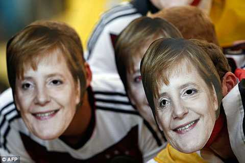 22h31: Rất nhiều mặt nạ có in hình Thủ tướng Đức Angela Merkel đã có mặt trên các khán đài