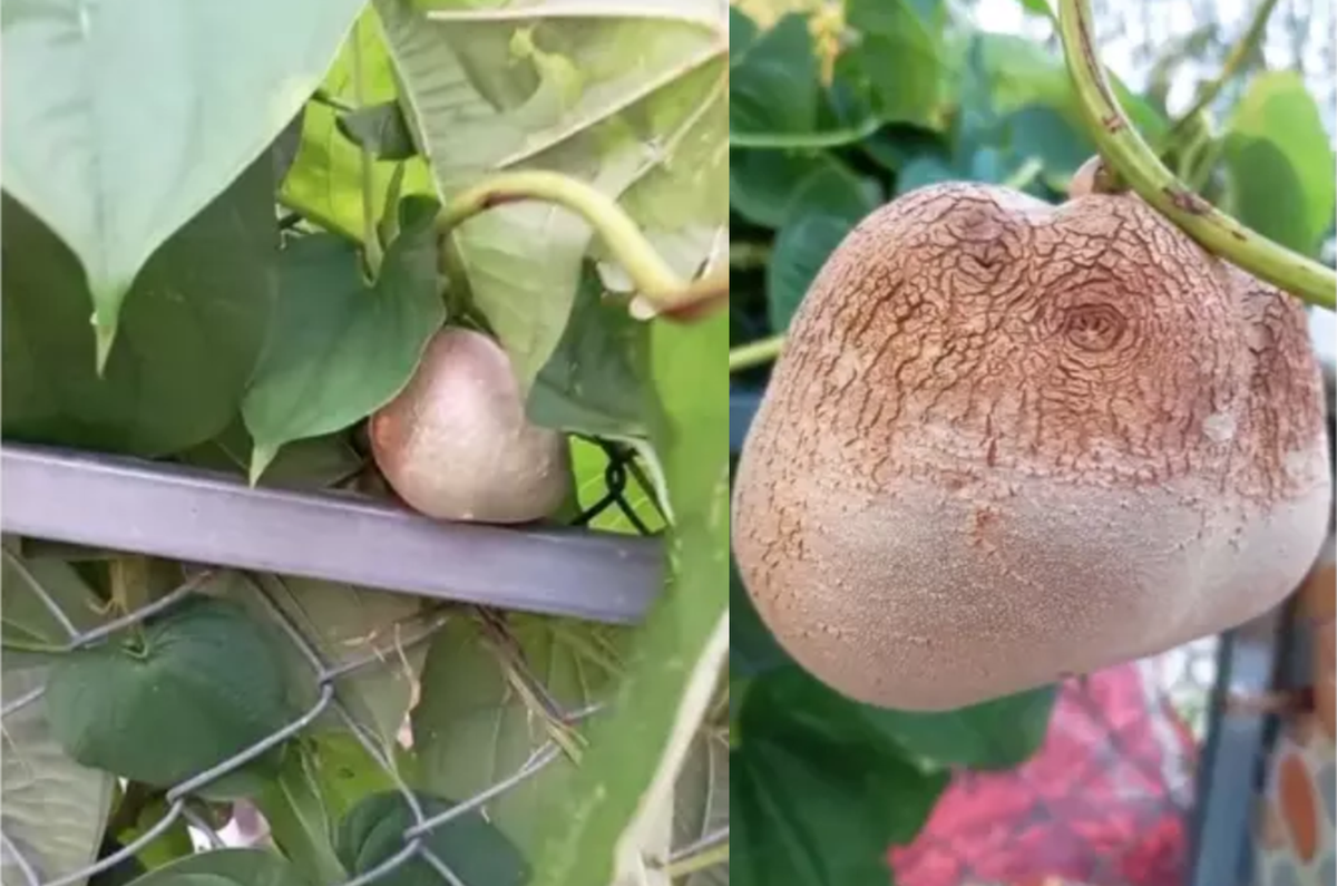 Theo đó, đoạn video ngắn quay lại cảnh một loại củ nửa giống khoai, nửa lại như củ sắn. Lạ lùng hơn là nó lại mọc trên giàn dây như một loại quả chứ không phải củ.