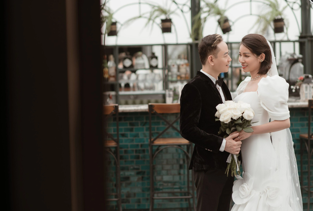 Trong bộ ảnh cưới mới thực hiện, Tùng Dương bảnh bao trong bộ vest xám còn cô dâu thì lộng lẫy với váy cưới trắng tinh khôi.