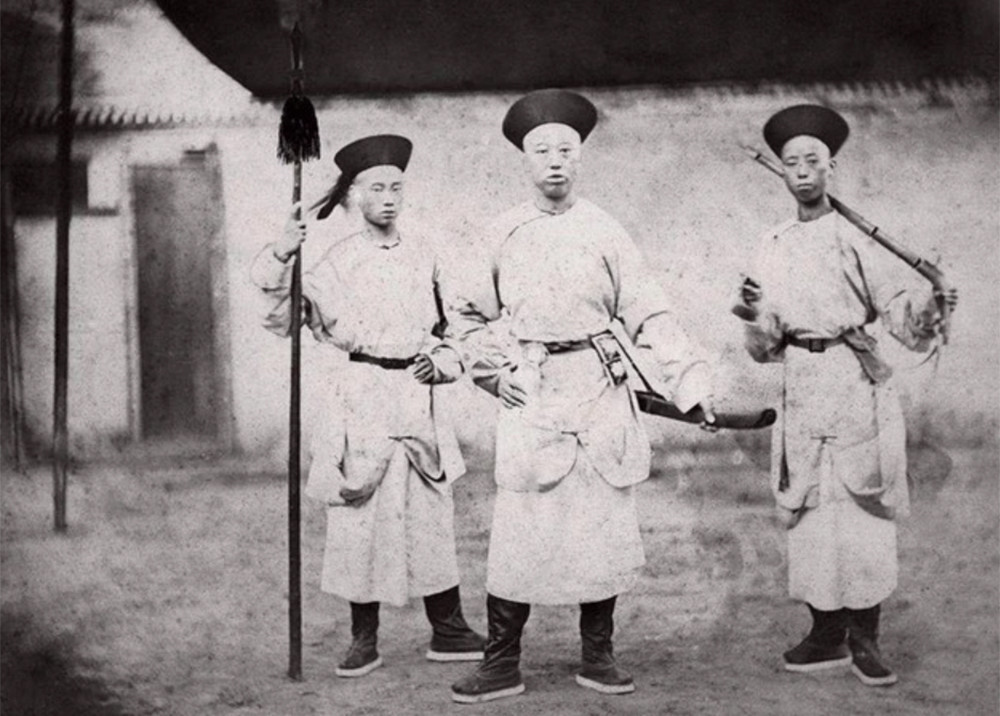 Các lính canh trong Tử Cấm Thành. Đây là một bức ảnh cũ do Liang Shitai, một nhiếp ảnh gia trong cung chụp cho các lính canh vào năm 1863. Khác với trong những bộ phim cổ trang, lính canh ở đời thực không có ngoại hình quá cao lớn vạm vỡ. Tuy nhiên, họ vẫn giữ được vẻ uy nghiêm vốn có.