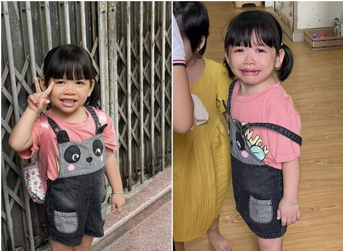 Ngày đầu tiên đi học, vừa cười vui trước cửa nhà xong đã thấy em mắt ướt nhạt nhòa trong lớp học. (Ảnh: Hà My)