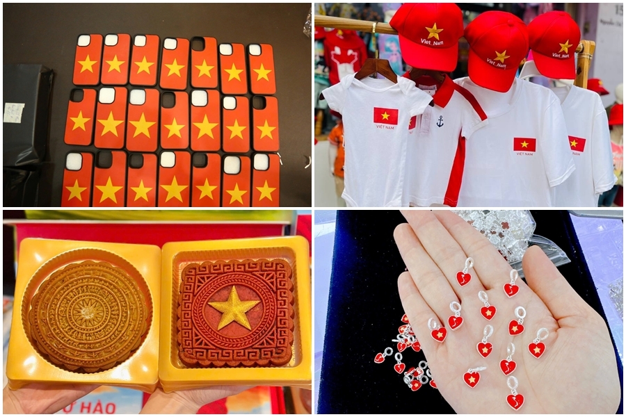 Các phụ kiện như cờ Tổ quốc đủ kích cỡ, băng rôn mini, nón sao vàng...giá dao động từ 15.000 - 100.000 đồng đang được bày bán rầm rộ. (Ảnh: Công Thương)