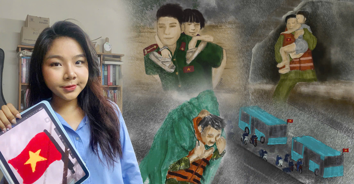 Với bút vẽ và máy tính bảng, Đồng An Thư ghi lại những khoảnh khắc xúc động trong cơn bão Yagi và cho ra đời một bộ tranh đầy cảm xúc, tái hiện cảnh tượng lực lượng chức năng và các chiến sỹ giúp dân, người dân nhau vượt qua khó khăn trong bão.