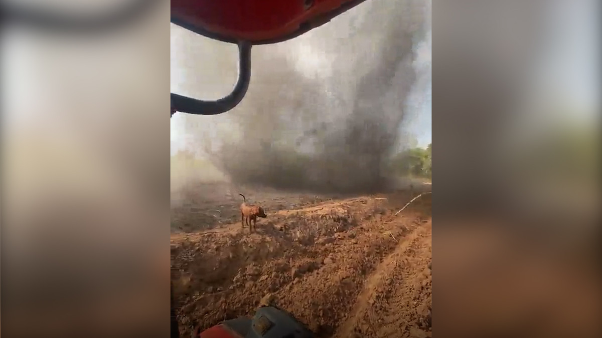 Người nông dân gặp một phen thót tim khi cơn lốc xoáy dữ dội cuốn đất lên không trung, càn quét trên đồng ruộng ở tỉnh Chaiyaphum, Thái Lan.