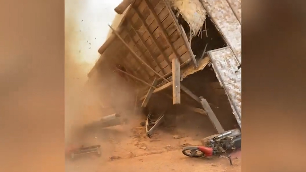 Cơn lốc mạnh xuất hiện tại tỉnh Savannakhet (Lào) thổi bay các tấm tôn trước khi xé toạc một ngôi nhà.