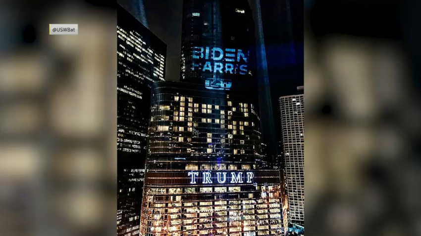 Theo NBC Chicago, Nghiệp đoàn công nhân ngành thép đã sử dụng máy chiếu ngoài trời để chiếu dòng chữ Biden - Harris màu xanh lam lên tòa nhà 98 tầng, ngay bên trên tên Trump của tòa tháp này.