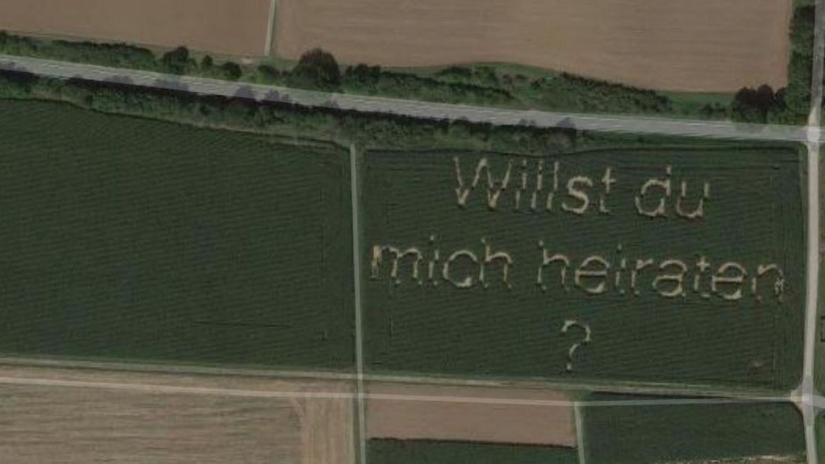 Bằng chiếc máy gieo hạt, chàng nông dân 32 tuổi Steffen Schwarz sống tại Huettenberg, miền Trung nước Đức đã "viết" dòng chữ "Em sẽ cưới anh chứ?" bằng tiếng Đức trên cánh đồng ngô của mình để hỏi cưới bạn gái.