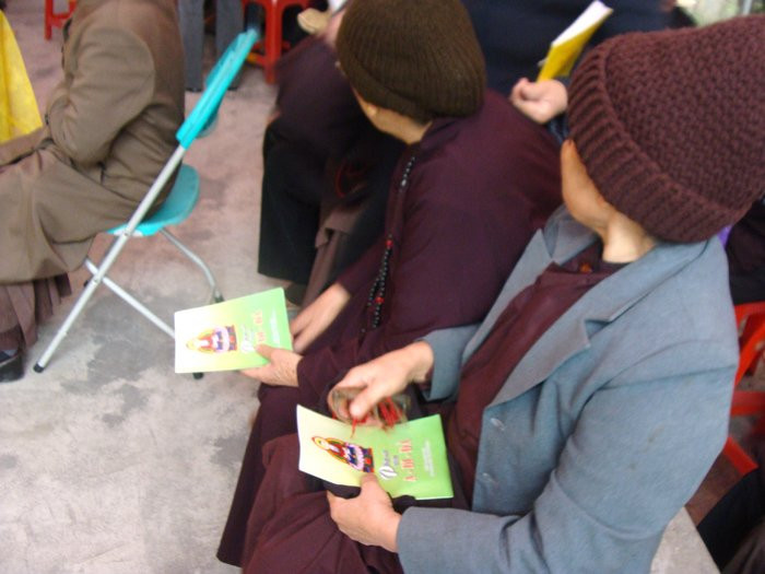Sau khi chuẩn bị lễ nghi đầy đủ, cuộc tụng kinh của hơn 20 Phật tử diễn ra ngay bên chiếc giường ông V. nằm. Ông V. nhắm mắt tịnh tâm, miệng nhẩm theo lời các Phật tử. Cuộc tụng kinh hộ niệm diễn ra trong vòng hơn 1 giờ đồng hồ. Khi các Phật tử ra về, gia đình bật chiếc đài ghi âm lời tụng kinh để ông V. tiếp tục được nghe.