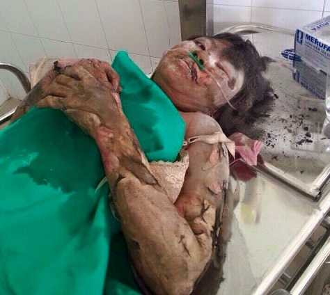 Toàn thân chị đang được băng bó, dịch từ vết thương đang thấm ra và nhuốm lớp băng y tế. Một phần gương mặt chị bị biến dạng.