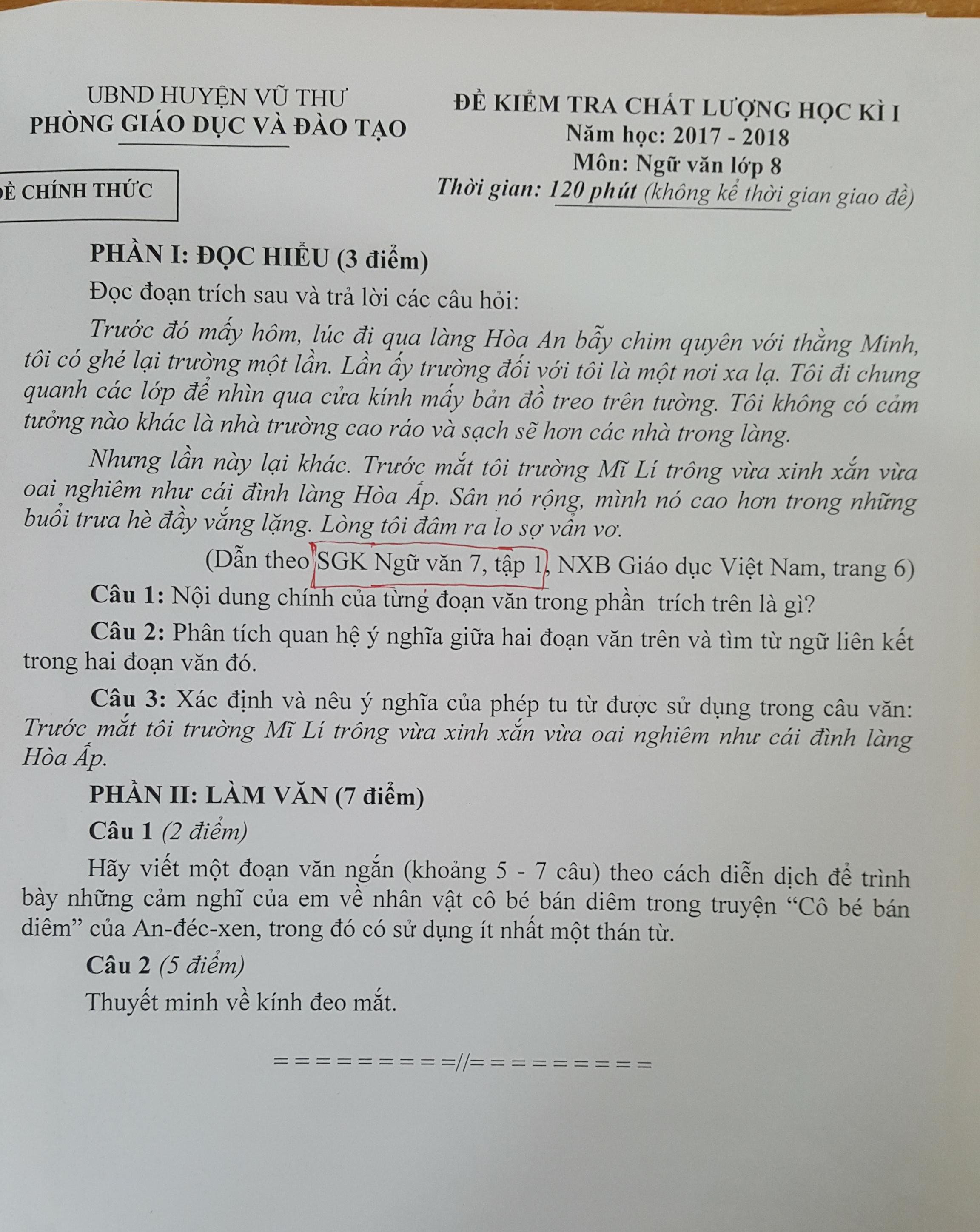 Ông Thắng cho biết, đây là đề thi môn Ngữ văn học kỳ 1 dành cho học sinh khối 8 tại địa phương. Theo phản ánh, đề thi bị sai ở phần chú thích đoạn trích thuộc tác phẩm 'Tôi đi học' của nhà văn Thanh Tịnh trong SGK Ngữ văn lớp 8 tập 1, chứ không phải trong SGK Ngữ văn lớp 7 tập 1.