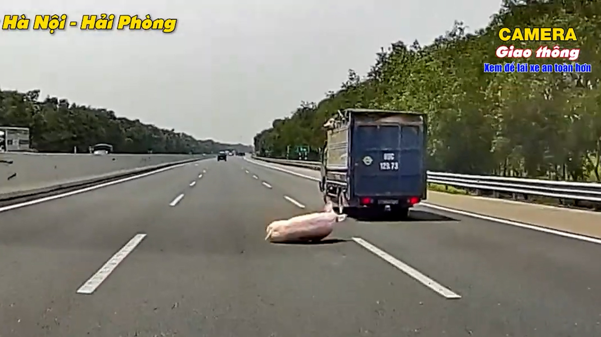 Một con lợn bất ngờ vượt ra khỏi chiếc xe tải và rơi xuống đường cao tốc Hà Nội - Hải Phòng gây nguy hiểm cho các phương tiện đang lưu thông trên đường.