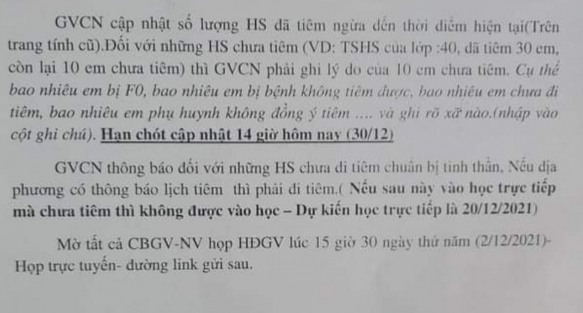 Phòng Giáo dục và Đào tạo huyện Đức Hòa, tỉnh Long An cho biết đã liên hệ Ban giám hiệu Trường THCS Mỹ Hạnh nơi phát đi văn bản, để xác thực. Theo đó, Ban Giám hiệu nhà trường xác nhận có ra thông báo, trong đó có nhắc đến nội dung: “Nếu sau này vào học trực tiếp mà chưa tiêm thì không được vào học”.