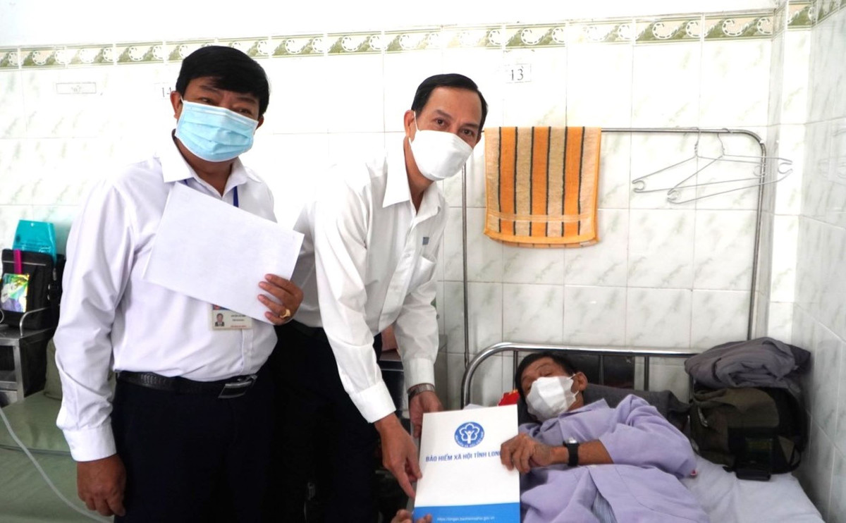 Lãnh đạo BHXH tỉnh Long An (giữa) tặng quà cho bệnh nhân BHYT có hoàn cảnh khó khăn.