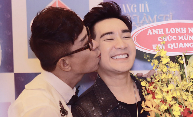 Giọng ca "Tóc em đuôi gà" tình tứ hôn má Quang Hà trong buổi họp báo.