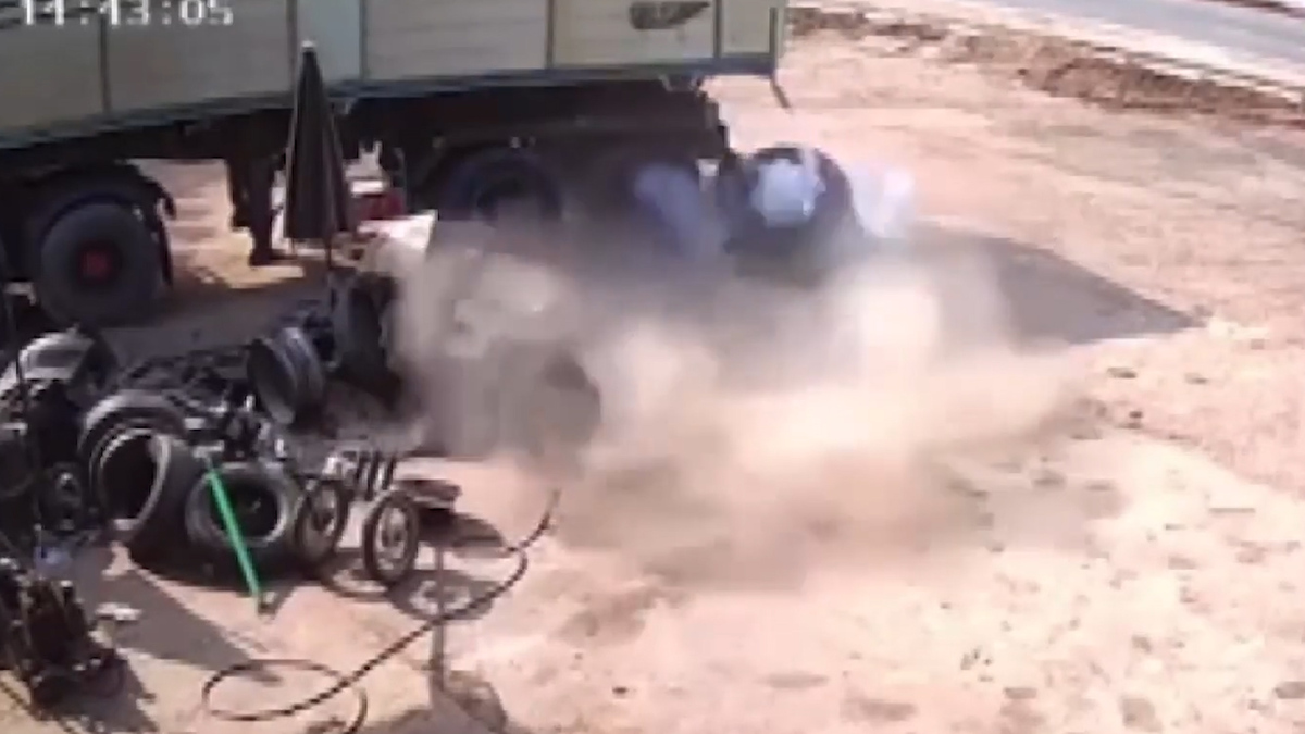 Một thợ học việc tại tỉnh Nakhon Ratchasima, Thái Lan bơm lốp xe tải quá căng khiến nó nổ tung, hất văng anh này ra xa.
