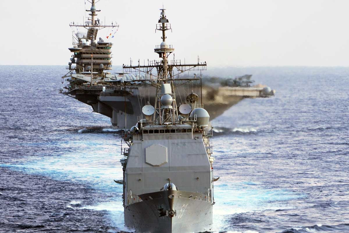Tàu tuần dương lớp Ticonderoga trong đội hình nhóm tác chiến tàu sân bay.