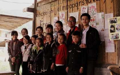 | Peter (người thứ 2 từ phải sang) mở lớp học tiếng Anh miễn phí và nuôi trẻ em nghèo Sapa với mong muốn chúng có con "CHỮ". |