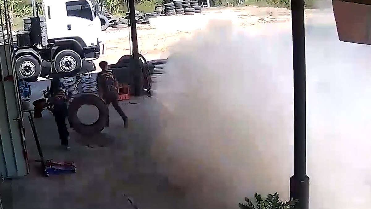 Người thợ bơm lốp xe quá căng khiến nó phát nổ, tung ra đám bụi mù mịt bao trùm cả nhà xưởng ở Nakhon Sawan, Thái Lan.